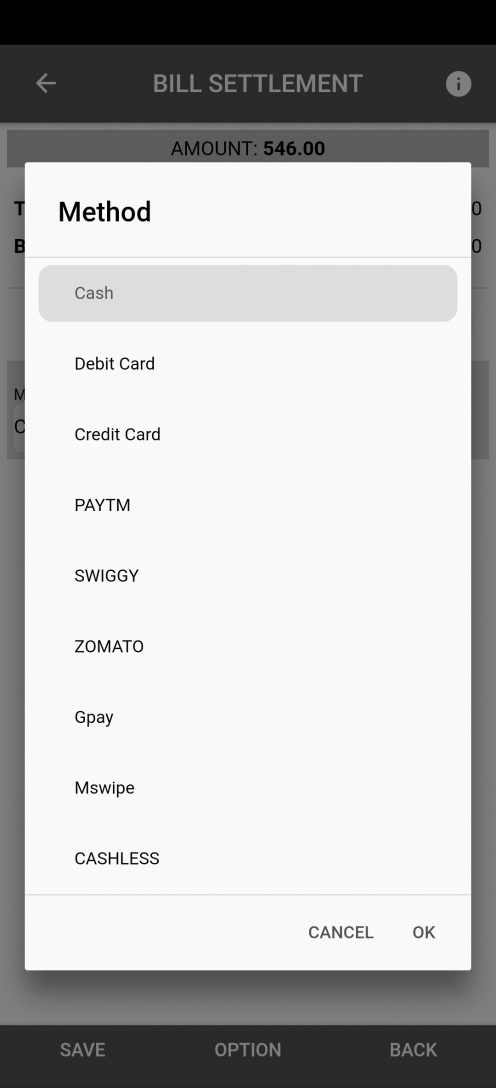 On the Bill settlement screen, select the appropriate option from the drop down menu, 'Method' E.g. Cash if the payment is to be done via cash and click on 'Save'.