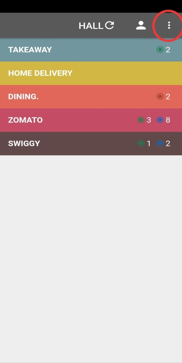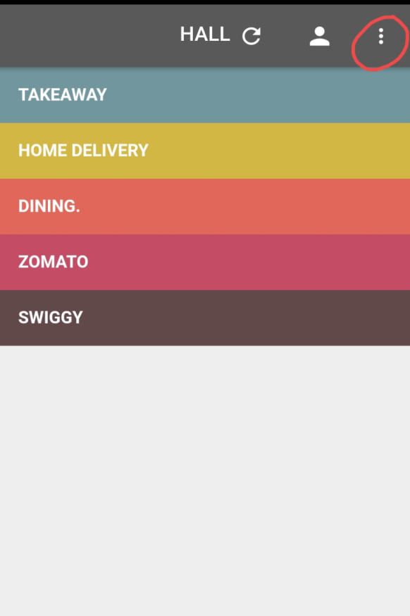 On logging in to PoketPos app, the top right hand corner shows three vertical dots or the options tab.